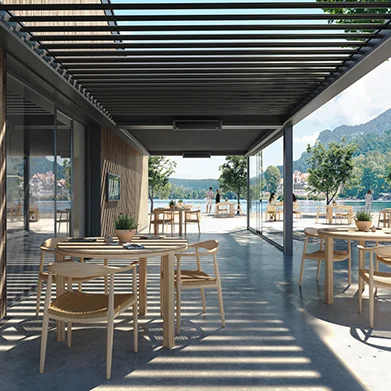 • Schiebeelemente aus Glas, Holz oder Aluminium für einen seitlichen Sicht- und/oder Wetterschutz